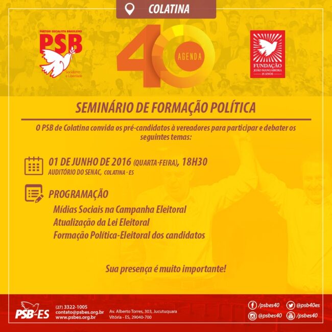 PROGRAMAÇÃO 09:00h – Boas vindas aos participantes 09:30h – Abertura do evento com autoridades do partido e convidados 10:00h – Contabilidade Eleitoral – Prestação de Cotas nas Eleições 2016 Convidada – Roseane Nogueira – Representante da Empresa INTEGRA 10h:20min – Atual Conjuntura Política BrasileiraConvidada – Presidente Estadual do PSB – Kátia Born Ribeiro 10h:40min –…