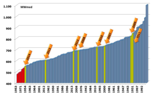 Ao contrário do que diz o governo, a crise atual não pode ser explicada pela hidrologia. O histograma mostra que, no período recente, tivemos mais anos chuvosos do que secos. Apenas 2012 e 2014 registraram afluências abaixo da média histórica. Em condições normais, o sistema absorveria com facilidade essas duas ocorrências.