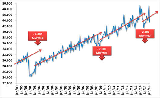 Também não é verdade que a crise possa ser explicada por um aumento anormal do consumo. Ao contrário, desde 2001 tivemos três momentos em que a tendência do consumo se ajustou bruscamente para baixo: em 2001 (por causa do racionamento), em 2009 (por causa da recessão) e atualmente, em 2015 (por causa do brutal aumento das tarifas e do início de uma nova recessão). Nosso sistema elétrico ainda não entrou em colapso porque estamos em uma espécie de racionamento não declarado, com uma queda de 2 mil MW médios na carga demandada.