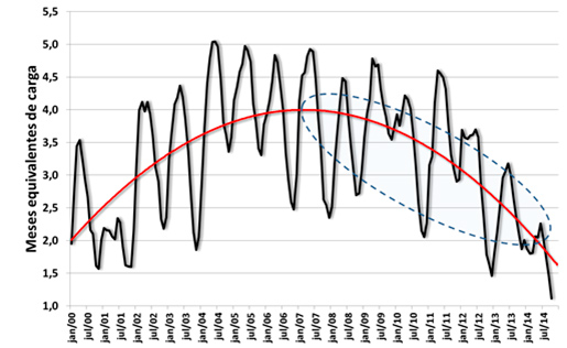 A crise atual começou a se desenhar em 2008, sem nenhuma relação com a hidrologia, e não teve resposta do governo. O gráfico abaixo apresenta a reserva total dos nossos reservatórios dividida pela carga total do sistema, mês a mês, entre 2000 e 2014. A curva de tendência mostra a evolução da nossa “poupança energética”, que diminuiu aceleradamente no período demarcado pela elipse pontilhada. Note-se que, como já vimos, houve mais anos chuvosos do que secos entre 2009 e 2014. Mesmo assim, em julho de 2014 os reservatórios acumulavam água suficiente para garantir pouco mais de um mês de consumo energético.