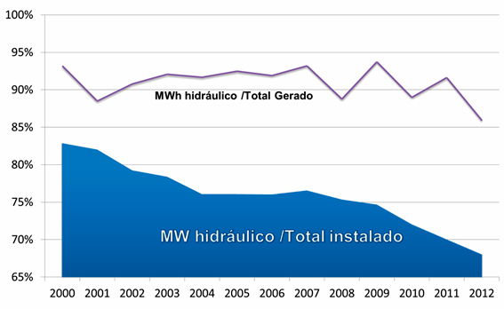 Se o esvaziamento dos reservatórios não decorre de falta de chuvas nem de um crescimento anormal do consumo, qual a sua causa? Há um descompasso entre a energia estocada nas usinas hídricas (total instalado) e a energia efetivamente gerada por essas usinas (total gerado), ano a ano, sempre como percentagem da energia total. Por falta de investimentos, as usinas hídricas vêm sendo sobrecarregadas. Em 2012, por exemplo, elas guardavam menos de 70% do potencial instalado e geraram mais de 85% da oferta.
