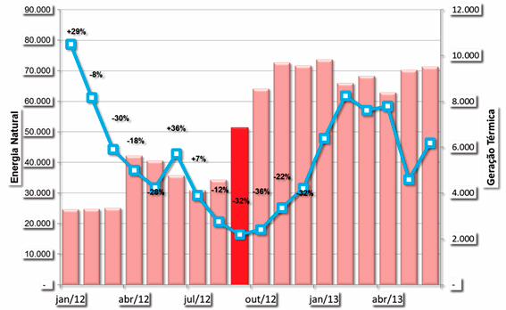 A Medida Provisória nº 579 provocou, ao mesmo tempo, uma queda artificial nas tarifas e um aumento no uso da geração térmica, muito mais cara. Desde o início, portanto, ela era insustentável. No gráfico abaixo, a linha oscilante indica a energia natural que o sistema recebe das chuvas e as barras mostram o despacho das térmicas.