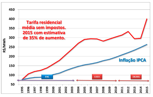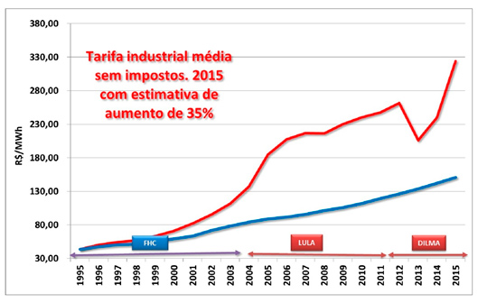 Em 2015, a tarifa industrial e a tarifa residencial ficarão pelo menos 115% e 52% mais caras, respectivamente, do que as de 1995, em valores reais, em uma estimativa claramente conservadora.