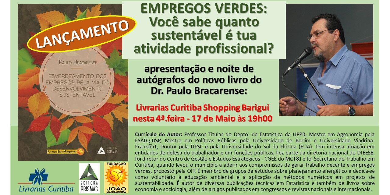 O presidente da Fundação João Mangabeira, Renato Casagrande, estará na noite desta quarta-feira, 17 de maio, na capital do Paraná, onde participará do lançamento e da noite de autógrafos do livro “Esverdeamento dos empregos pela via do desenvolvimento sustentável” nas livrarias Curitiba no Shopping Barigui. O autor Paulo Bracarense é coordenador da FJM do Paraná, professor de Estatística da UFPR, mestre em agronomia pela ESALQ-USP, Mestre em políticas públicas pela Universidade de Berlim e Universidade Viadrina-Frankfürt, doutor pela UFSC e pela Universidade do Sul da Flórida(EUA). A edição do livro recebeu financiamento da FJM e deverá integrar o acervo da Fundação.