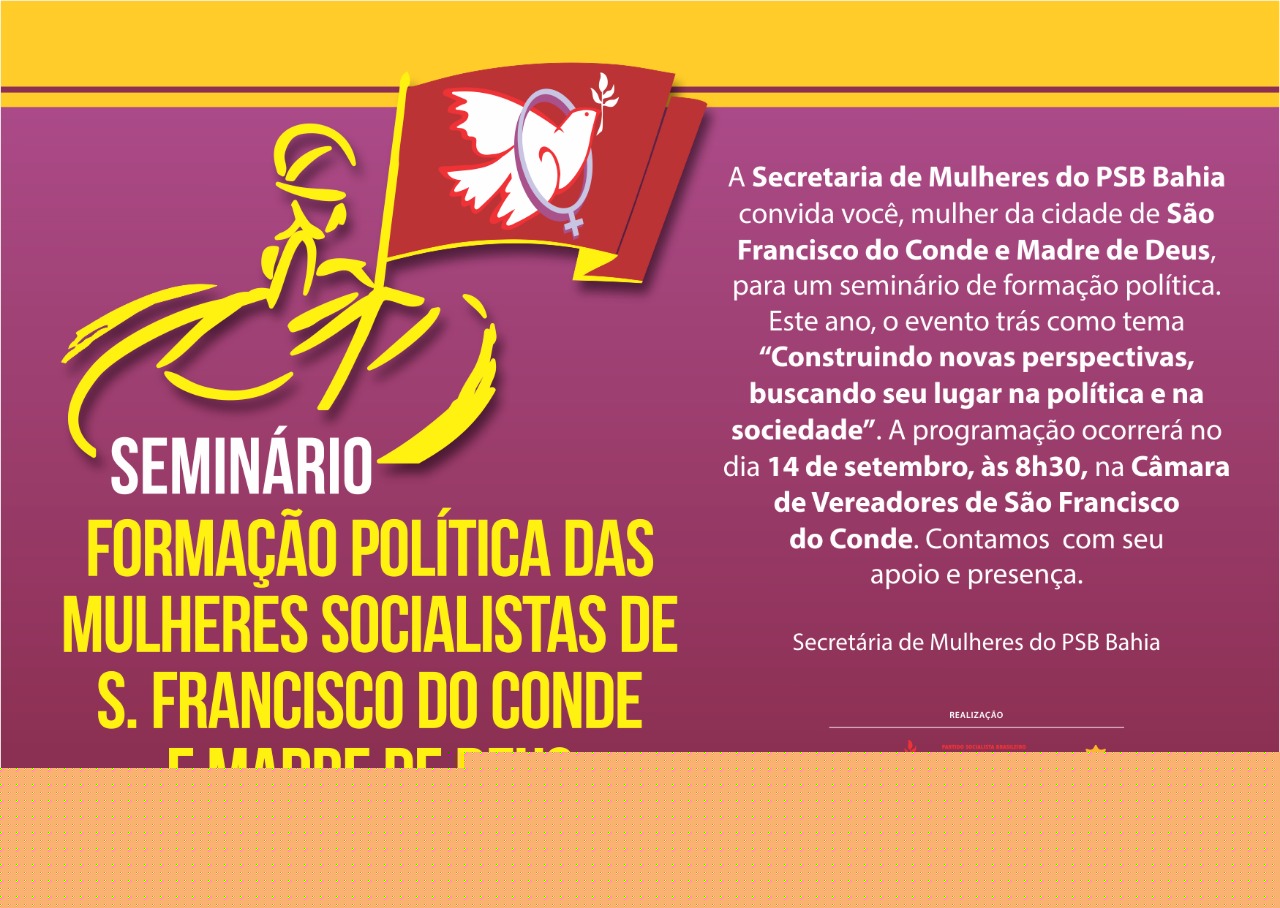 De 14 de setembro a 5 de outubro, em quatro datas diferentes, a Secretaria de Mulheres do PSB – Bahia, realiza, com apoio da Fundação João mangabeira(FJM) um ciclo de seminários para a formação política das mulheres ligadas ao partido. Com o tema “Construindo novas perspectivas, buscando seu lugar na política e na sociedade”, as capacitações ocorrerão nos municípios de São Francisco do Conde, Camaçari, Serrinha e Salvador.