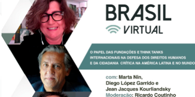 Em sua 20ª edição, o Pense Brasil, ciclo de conferências, palestras e debates orientado para a compreensão e a elaboração de temas e questões estratégicas para o nosso país, discutiu o papel das fundações e think tanks internacionais na defesa dos direitos humanos e da cidadania crítica na América Latina e no mundo. Realizado de forma virtual desde o início da pandemia, essa edição do debate contou com a mediação do presidente da Fundação João Mangabeira, Ricardo Coutinho, e três convidados internacionais: Marta Nin, diretora da Casa Amèrica Catalunya (Barcelona – Espanha); Diego López Garrido, vice-presidente executivo da Fundación Alternativas (Madrid – Espanha); e Jean Jacques Kourliandsky, diretor do Observatório América Latina da Fondation Jean-Jaurès (Paris – França).