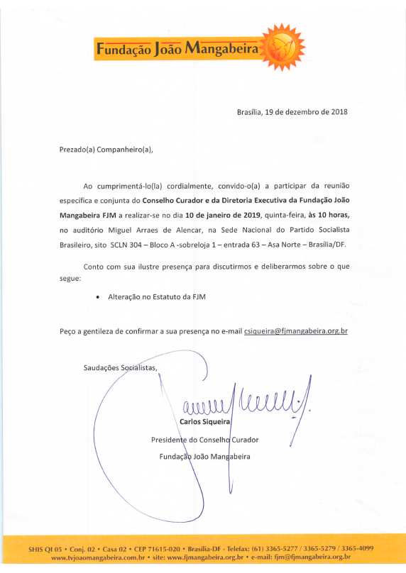 Convocação Reunião extraordinária do Conselho Curador da FJM 10 de Janeiro de 20199 de janeiro de 2019