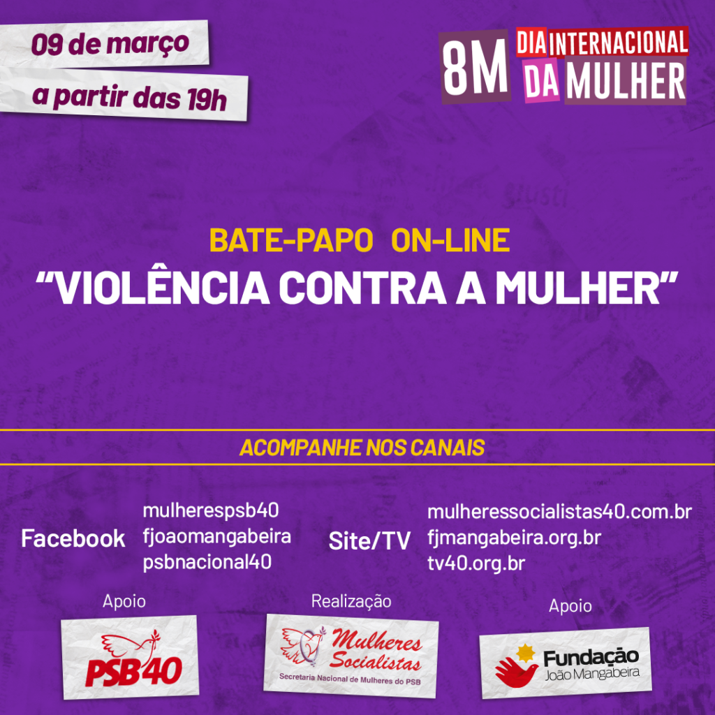 O QUÊ: Encerramento da campanha da Secretaria Nacional de Mulheres do PSB sobre o 8M Dia Internacional da Mulher com bate-papo “Violência contra a mulher”, com transmissão ao vivo pelas redes sociais da secretaria.