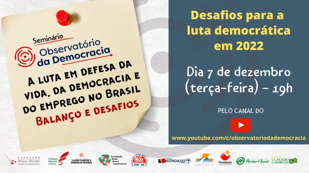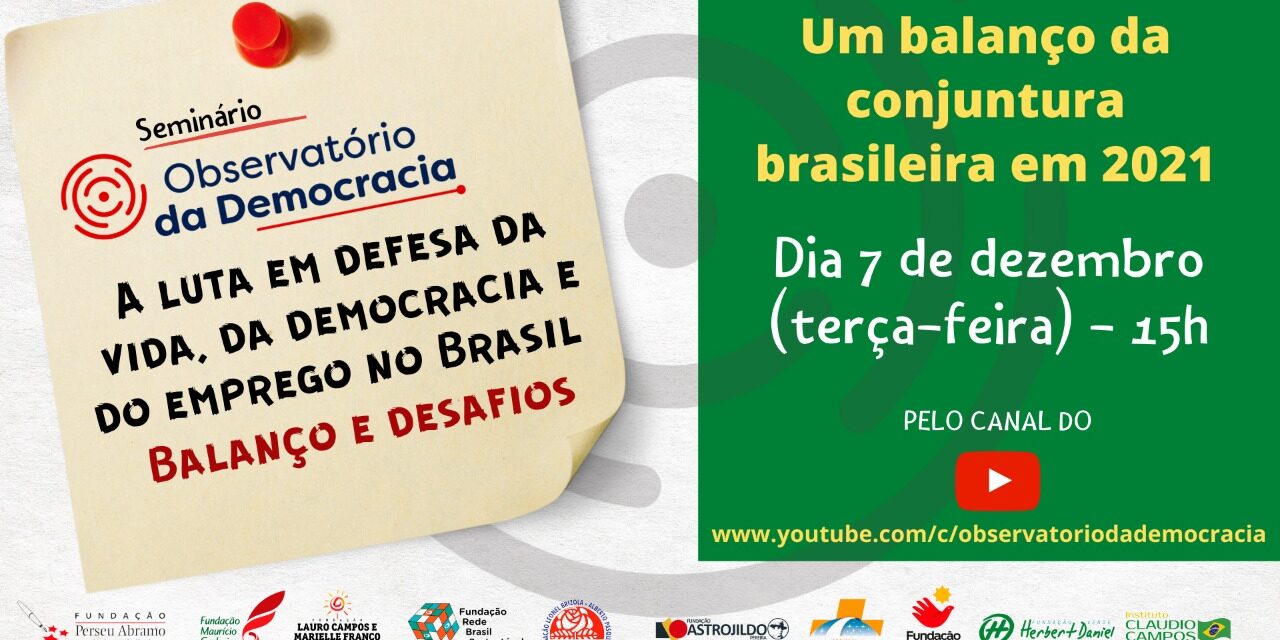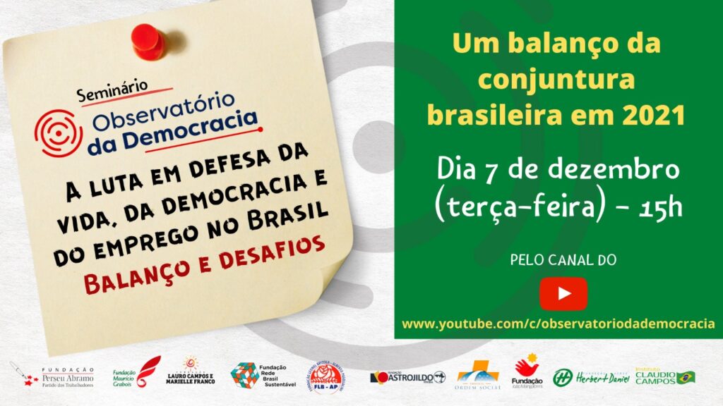 O Observatório da Democracia, articulação composta por dez fundações partidárias, realizará nesta terça-feira (07/12) o seminário ‘A luta em defesa da vida, da democracia e do emprego no Brasil – Balanço e desafios. Composto de dois debates, o seminário vai fazer um balanço dos ataques, promovidas pelo governo de Jair Bolsonaro à democracia e à vida em 2021.