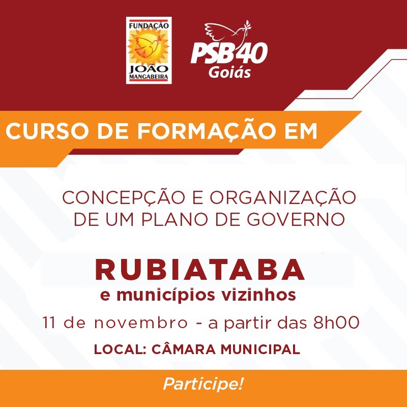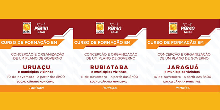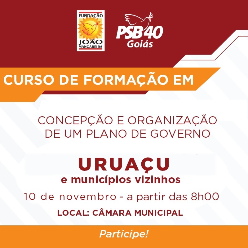 A Escola Miguel Arraes, da Fundação João Mangabeira (FJM), e o Partido Socialista Brasileiro (PSB) convidam estudantes, vereadores e lideranças de Jaraguá, Uruaçu, Rubiataba e cidades da região para o curso de administração pública, continuando a formação política do primeiro semestre, desta vez tratando da formulação de um plano de governo, processo orçamentário, Lei de Responsabilidade Fiscal, políticas sociais e programa de governo.