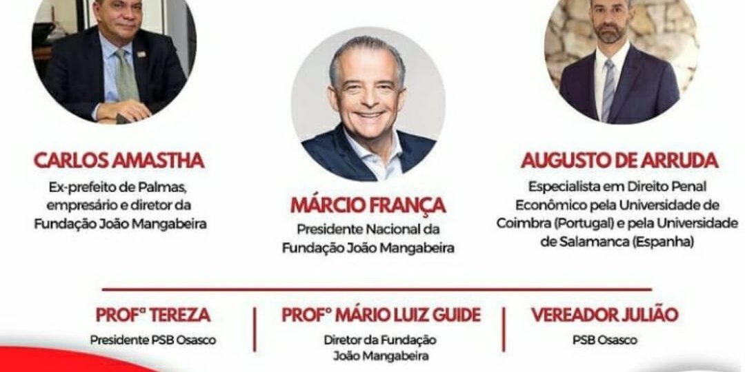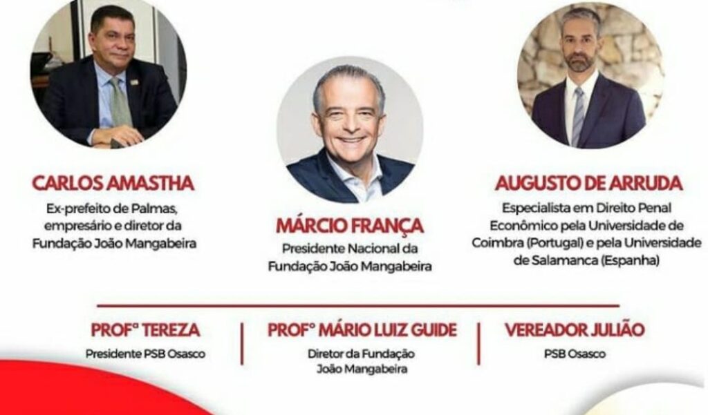 Participaram o presidente da Fundação João Mangabeira (FJM) Márcio França; o empresário, ex- prefeito de Palmas (TO) e diretor da FJM, Carlos Amastha; o jurista Augusto de Arruda Botelho, especialista em Direito Penal; o professor Mário Luiz, diretor financeiro da FJM; a presidente do PSB de Osasco, professora Tereza Santos, e do vereador Julião (PSB). A mediação ficou por conta do professor Mário Luiz Guide, que falou sobre a importância de discussões, como a do tema escolhido, para dar fim aos principais problemas do país.