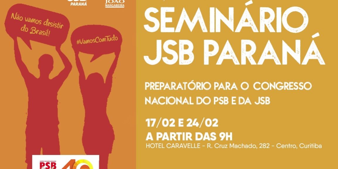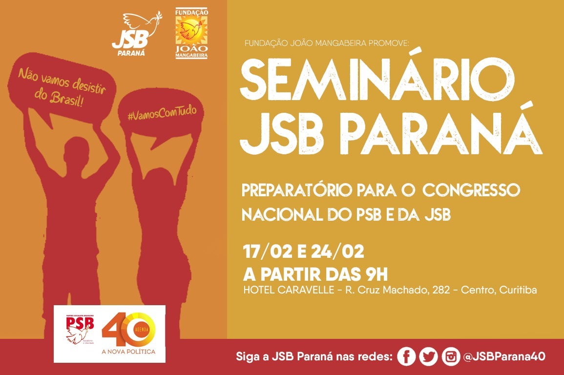 Como parte da Agenda 40 para as eleições 2018, a Fundação João Mangabeira (FJM) e a Juventude Socialista Brasileira do Paraná, realizam o Seminário Preparatório Para os Congressos Nacionais do PSB e da JSB. O evento acontecerá em dois sábados – 17 e 24/02, das 08:30 às 18:00, no Hotel Caravelle, R. Cruz Machado, 282, Centro – Curitiba-PR.