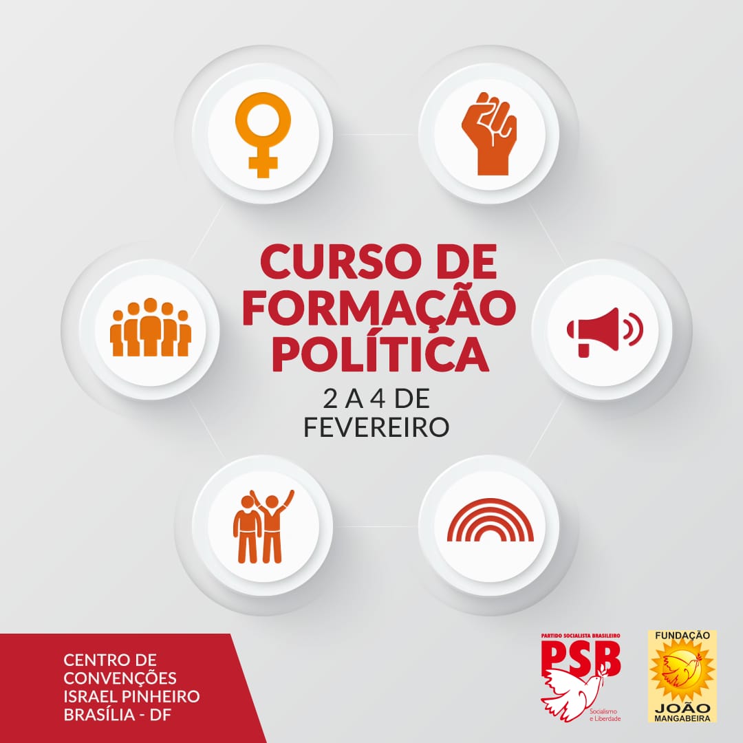 Acreditamos que a boa formação política dos dirigentes do PSB é essencial para o desenvolvimento de Políticas Partidárias. Por isso, entre os dias 2 e 4 de fevereiro, realizaremos o Curso de Formação Política, voltado para os seis segmentos sociais do partido: o das Mulheres (SNM), do Movimento Popular (MPS), da Negritude (NSB), dos LGBT, do movimento Sindical (SSB) e da Juventude (JSB).