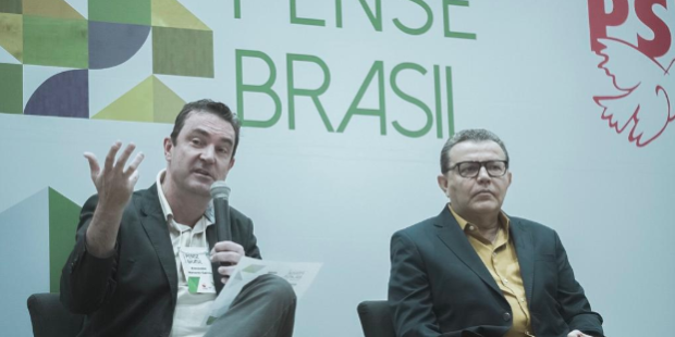 Vice-presidente da Fundação João Mangabeira, Alexandre Navarro, durante abertura do Pense Brasil Meio Ambiente, ao lado do presidente nacional do PSB, Carlos Siqueira