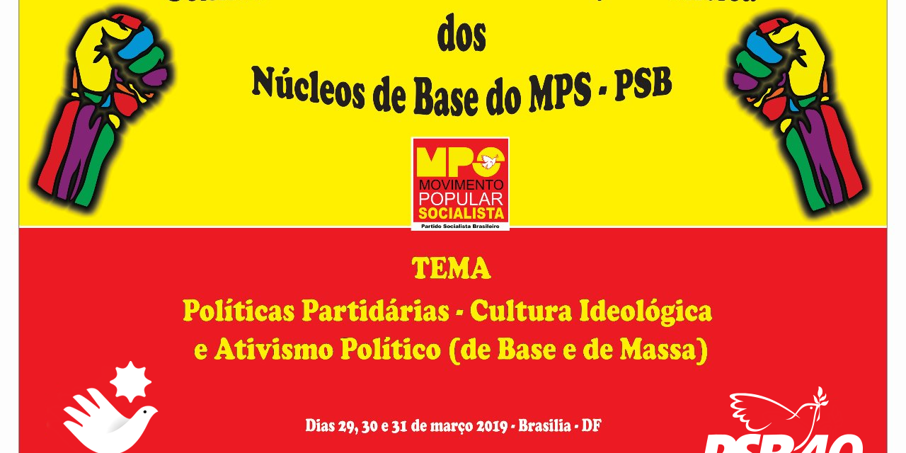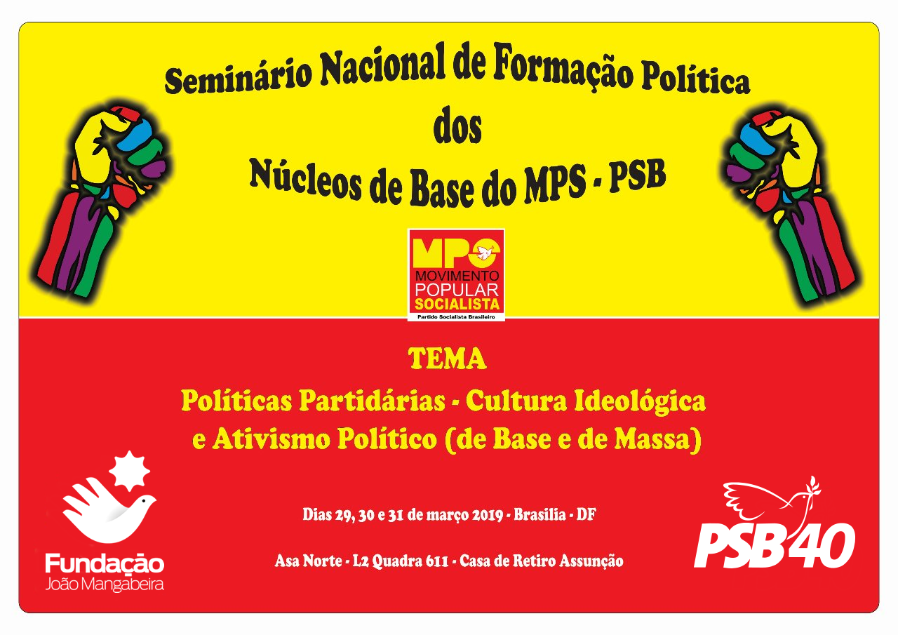 O Movimento Popular Socialista(MPS) e a Fundação João Mangabeira(FJM) realizam entre os dias 29 e 31 de março, em Brasília, o Seminário Nacional de Formação Política dos Núcleos de Base do MPS. Farão a abertura no início da noite do dia 29/3, o presidente do Partido Socialista Brasileiro, Carlos Siqueira, o secretário nacional do MPS, Acilino Ribeiro e o vice-presidente da FJM, Alexandre Navarro.