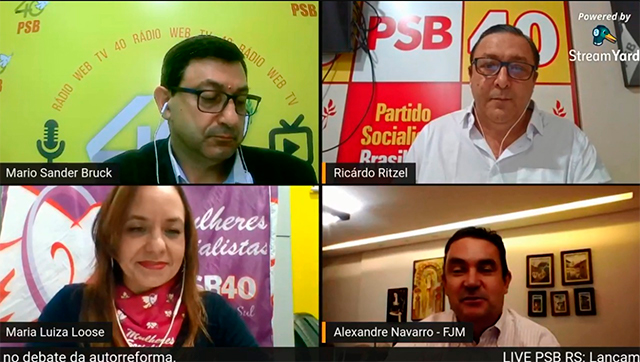 Na última sexta-feira, 30, o Partido Socialista Brasileiro no RioGrande do Sul (PSB/RS) transmitiu a live de lançamento de um projetoinédito para a sigla: a criação de 21 jornais regionais, no formatoonline, para divulgação das ações do partido no RS. O evento contoucom a participação do vice-presidente da Fundação João Mangabeira,Alexandre Navarro, do presidente estadual, Mário Bruck, da secretáriaestadual do Movimento de Mulheres Socialistas, Maria Luiza Loose, edemais lideranças do partido.
