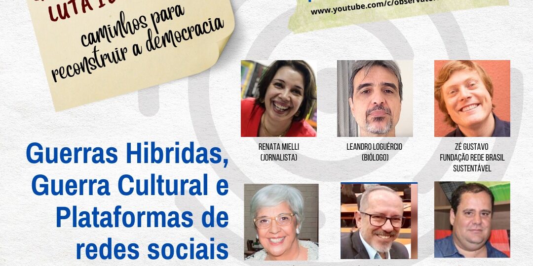O primeiro ciclo de debates organizado pelo ‘Observatório da Democracia’ foi realizado na noite de segunda-feira (31). Com transmissão pelo Youtube da entidade, o tema debatido foi “Guerras Híbridas, Guerra Cultural e Plataformas de redes sociais”, e teve a participação do advogado Lúcio Flávio Dias, da jornalista Renata Mielli, do biólogo Leandro Loguércio, do administrador público Zé Gustavo e da juíza Mara Loguércio, com moderação de Henrique Matthiessen, da Fundação Leonel Brizola.