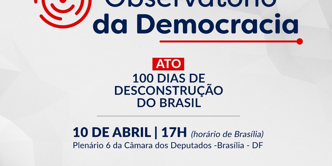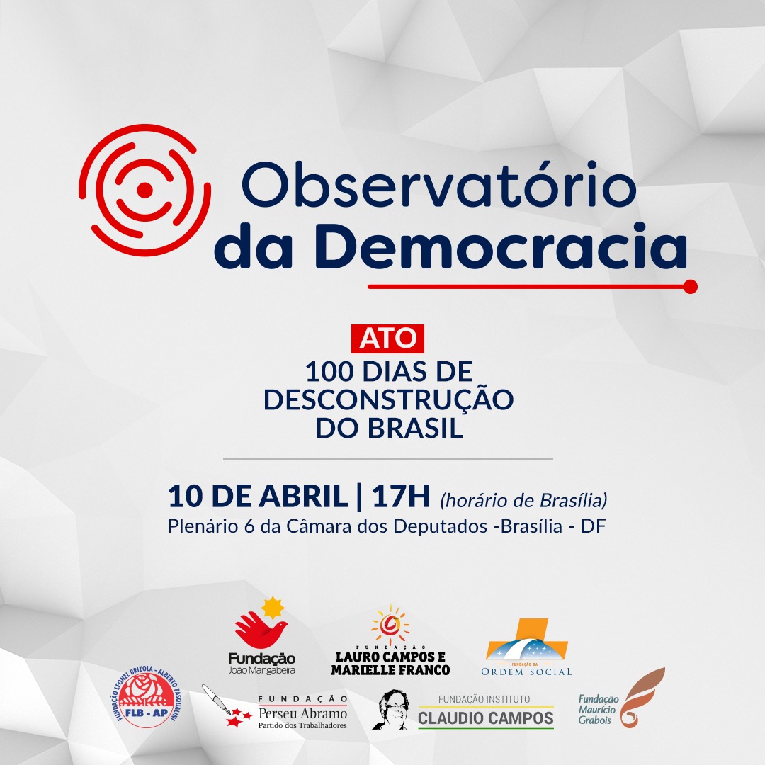 O Observatório da Democracia fará o ato “100 dias de desconstrução do Brasil” sobre os 100 dias de governo Bolsonaro, em Brasília, no dia 10/04. As sete fundações integrantes do Observatório apresentarão um relatório conjunto, com análises e dados que evidenciam as ameaças aos direitos e o desmonte da estrutura do Estado brasileiro resultantes dos primeiros meses deste governo.