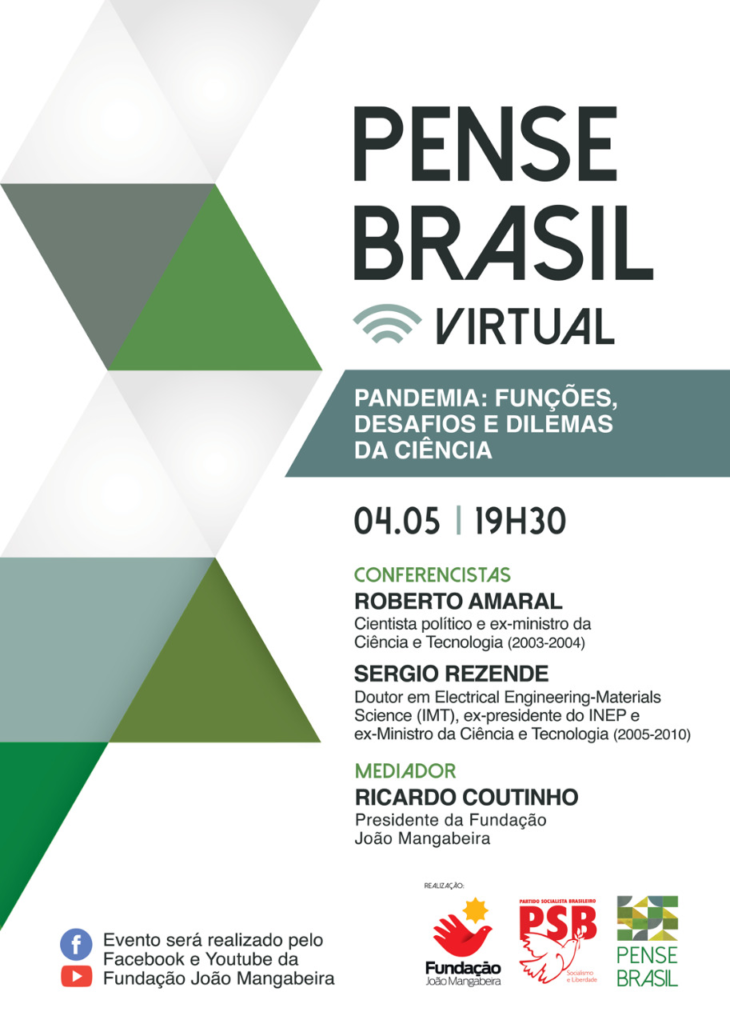 A Fundação João Mangabeira, ligada ao Partido Socialista Brasileiro, vai realizar nesta segunda-feira, 4/5, a 5ª edição do Pense Brasil Virtual que discutirá o Papel da Ciência no Combate à Pandemia. O debate terá como convidados os ex-ministros de Ciência e Tecnologia Sérgio Rezende e Roberto Amaral. A condução do trabalho será de Ricardo Coutinho, presidente da FJM.
