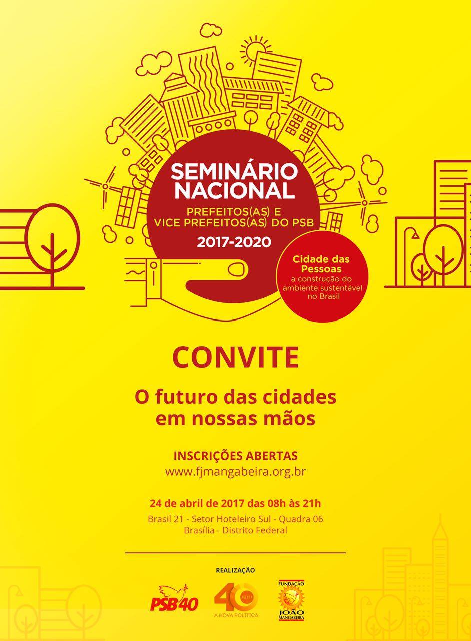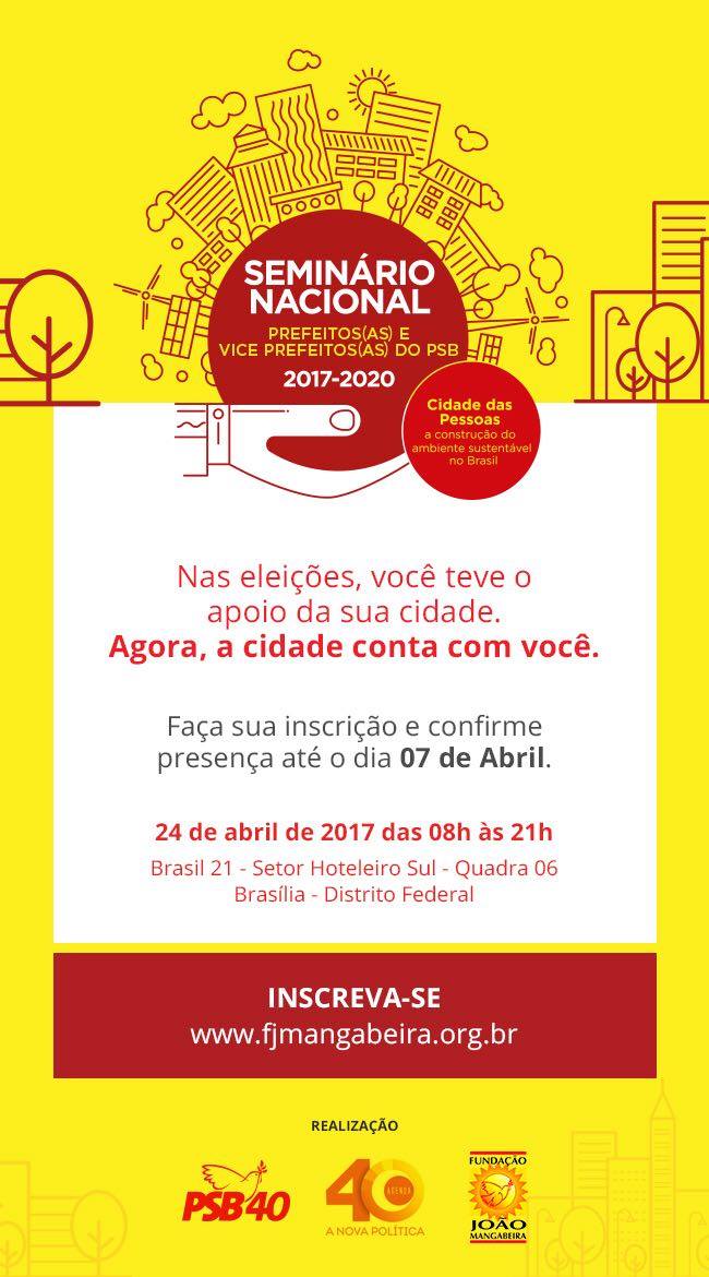 A construção de administrações municipais competentes necessita de um planejamento estruturado. Nas últimas eleições, o Partido Socialista Brasileiro (PSB) se consolidou como a maior força política da esquerda brasileira, elegeu 418 prefeitos e obteve mais de 10,8 milhões. Na busca por maior qualidade na gestão, a Fundação João Mangabeira (FJM), instituição de formação política e formulação de políticas públicas e o PSB, realizam o Seminário Nacional dos Prefeitos(as) e Vice-prefeitos(as), desta vez, com o tema: “Cidades das Pessoas: a construção do ambiente sustentável no Brasil”. Voltado aos prefeitos (as) e vice-prefeitos (as) do PSB, o evento será realizado no dia 24 de abril, no Centro de Convenções Brasil 21, em Brasília.