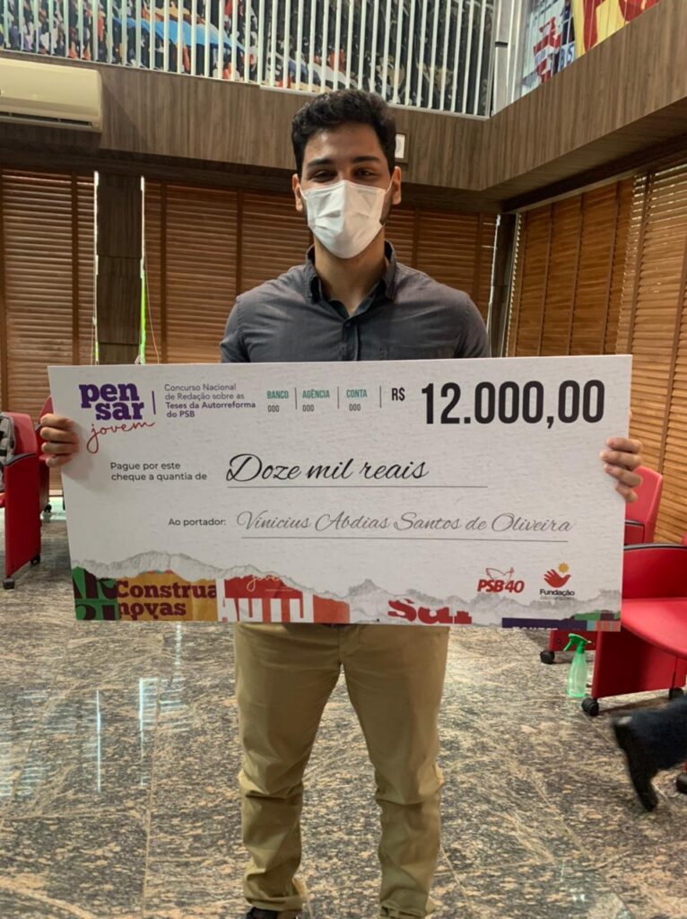 O segundo colocado, Vinicius Abdias Santos de Oliveira, também tem 24 anos, estuda medicina e é do Rio Grande do Norte. Sua redação foi um texto modificativo sobre a proposta de ampliação e acesso ao ensino superior público, e igualmente pode ser conferido na íntegra aqui. Vinicius contou que já tinha visto que o PSB estava passando por um processo de autorreforma nas redes sociais e foi por intermédio delas que também tomou conhecimento do concurso, em um tweet do presidente da juventude do partido, Tony Sechi. “Achei muito interessante a disponibilidade de um partido já consolidado, como o PSB, dar uma abertura tão ampla para que seus preceitos programáticos fossem discutidos, e resolvi participar do processo.” A respeito do tema escolhido, ele disse que leu a introdução do livro da autorreforma – “Brasil, Potência Criativa e Sustentável”, para entender como o PSB se posionava ante questões vitais que o país enfrentava e enfrentará no século XXI. Após isso, focou em eixos temáticos sobre os quais tinha maior domínio, e, por ser estudante universitário, achou que o tema em que mais poderia contribuir, seria, justamente, a ampliação do acesso à educação superior pública.
