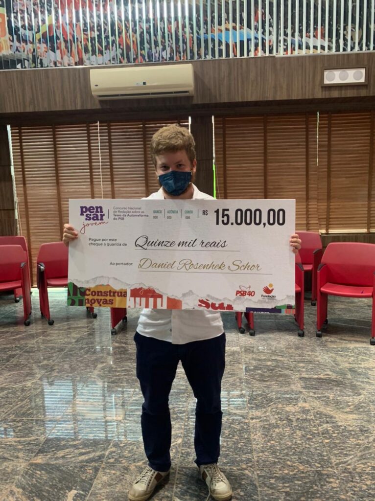 O grande vencedor, Daniel Rosenhek Schor, tem 24 anos, é advogado, de São Paulo, e fez uma redação aditiva sobre a reestruturação do sistema penal e carcerário brasileiro, que pode ser conferida na íntegra aqui. Para ele, poder contribuir pessoalmente no principal documento ideológico do PSB, deixando sua marca nessa construção coletiva e revolucionária que é a autorreforma, é mais importante que o prêmio. Sobre o tema de sua redação, Daniel disse que é um assunto que deixamos passar nos últimos anos, especialmente na eleição de 2018. “Chegou a hora de enfrentarmos esse debate e propormos soluções que levem em conta os direitos humanos, a tecnologia e conhecimentos psicossociológicos acumulados nas últimas décadas para tirar o Brasil de perto do topo dos rankings de violência no mundo”, concluiu. Bastante empolgado com a viagem à Brasília, Daniel quer conhecer e conversar com figuras importantes dentro do partido e espera que este seja o marco na sua trajetória dentro do PSB.