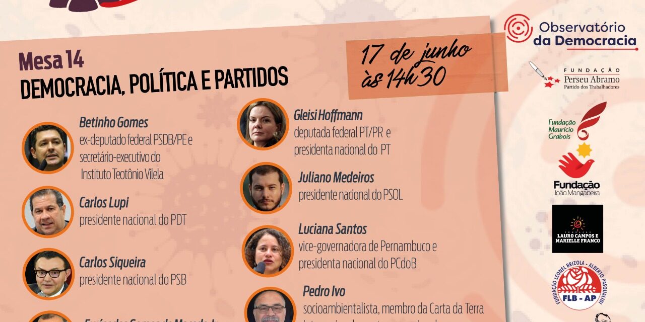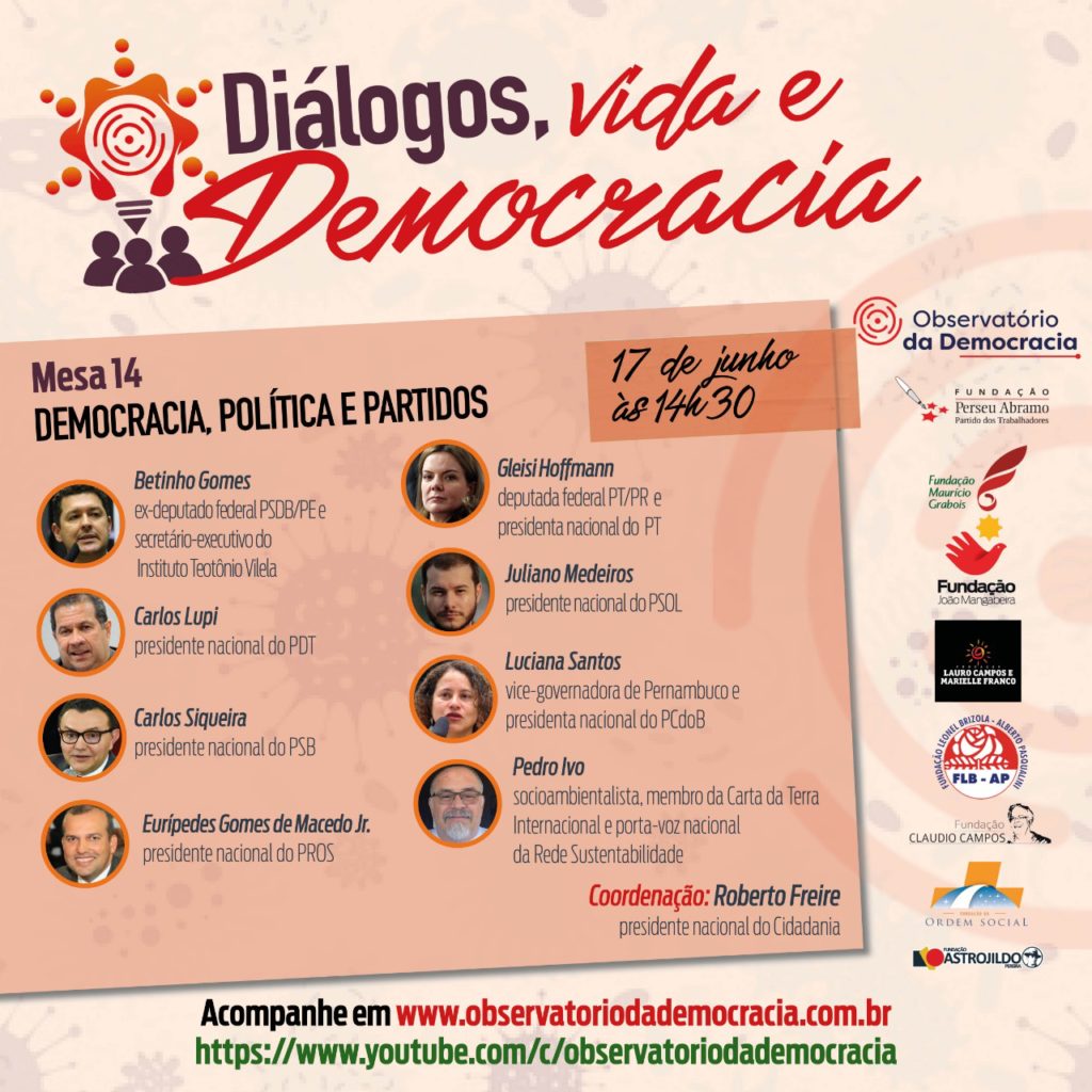 Nesta quarta-feira,17/06, acontecerá às 14h30 a mesa Democracia, Política e Partidos, que faz parte do Ciclo Diálogos, Vida e Democracia, uma série de videoconferências promovidas pelo Observatório da Democracia(OD), que chega a sua 14ª edição. A mesa será coordenada por Roberto Freire, que é presidente nacional do Cidadania, estarão participando o ex-deputado federal (PSDB/PE) e secretário executivo do Instituto Teotônio Vilela Betinho Gomes, o presidente nacional do PDT Carlos Lupi, o presidente nacional do PSB Carlos Siqueira, o presidente nacional do PROS Eurípedes Gomes de Macedo Jr, a deputada federal e presidenta nacional do PT Gleisi Hoffmann, o presidente nacional do PSOL Juliano Medeiros, a vice-governadora de Pernambuco e presidenta nacional do PCdoB Luciana Santos e o socioambientalista, membro da Carta da Terra Internacional e porta-voz nacional da Rede Sustentabilidade, Pedro Ivo.