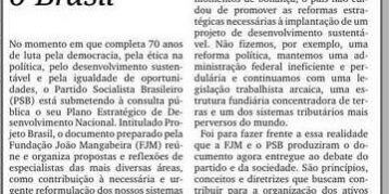 No momento em que completa 70 anos de luta pela democracia, pela ética na política, pelo desenvolvimento sustentável e pela igualdade de oportunidades, o Partido Socialista Brasileiro (PSB) está submetendo à consulta pública o seu Plano Estratégico de Desenvolvimento Nacional. Intitulado Projeto Brasil, o documento preparado pela Fundação João Mangabeira (FJM) reúne e organiza propostas e reflexões de especialistas das mais diversas áreas, como contribuição à necessária e urgente reformulação dos nossos sistemas político, econômico e institucional.