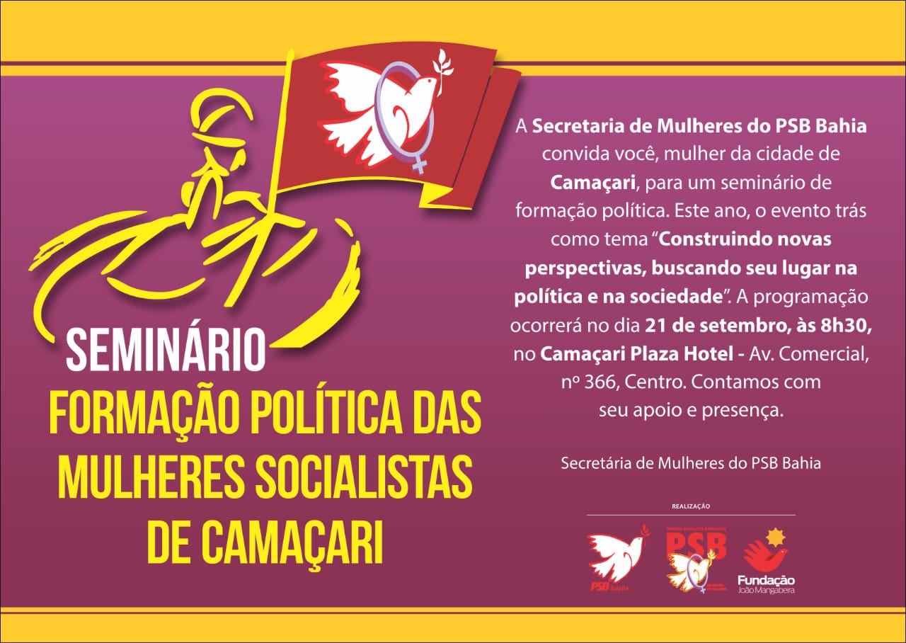 O PSB-BA promove, neste sábado (21), seminário que integra o Curso de Formação Política de Mulheres no município de Camaçari, na Região Metropolitana de Salvador. O evento será realizado no Camaçari Plaza Hotel, a partir das 9h.