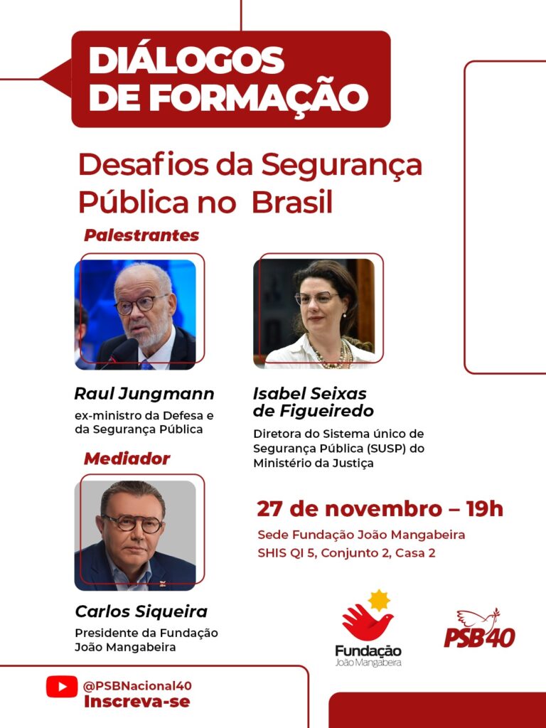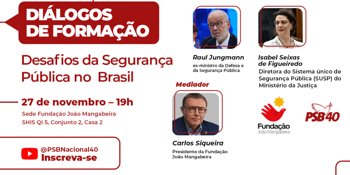 O tema da Segurança Pública será debatido no próximo ciclo Diálogos de Formação, organizado pela Fundação João Mangabeira (FJM). O presidente da FJM, Carlos Siqueira, será o moderador do debate que contará com grandes especialistas na área: o ex-ministro da Defesa e da Segurança, Raul Jungmann; e a atual diretora do Sistema Único de Segurança Pública (SUSP), Isabel Seixas de Figueiredo. O evento, em formato híbrido, será realizado na sede da instituição no Lago Sul, em Brasília, no próximo dia 27 de novembro, às 19h, com transmissão ao vivo pelo Youtube da FJM e do Partido Socialista Brasileiro.
