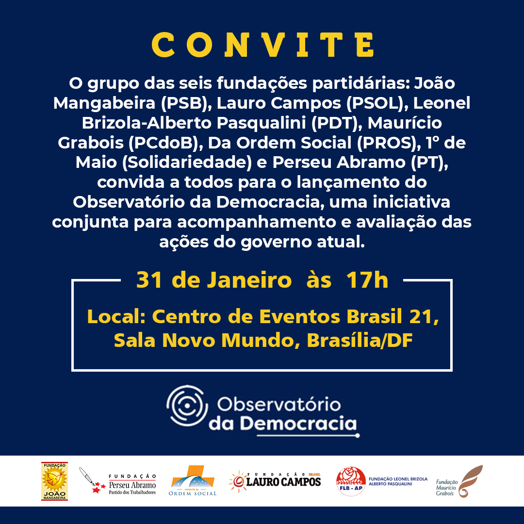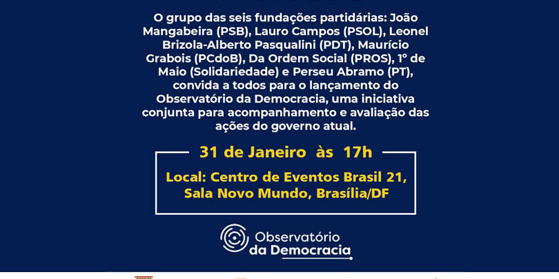 A Fundação João Mangabeira (FJM), em conjunto com cinco fundações partidárias, lançará na próxima quinta-feira, 31, o Observatório da Democracia, uma iniciativa de acompanhamento das ações do governo atual. Em defesa dos princípios básicos da democracia, entre outras conquistas sociais e econômicas, o grupo tem em comum o fato de manter posição crítica ao governo. Para o presidente da FJM, ex-governador da Paraíba, Ricardo Coutinho, “trata-se de um instrumento importante de afirmação e defesa da democracia, e de repercussão e análise das políticas públicas anunciadas ou que venham a ser anunciadas. O Observatório da Democracia é uma iniciativa com objetivo de estabelecer diálogos críticos sobre aquilo que está rondando as políticas públicas no Brasil”.