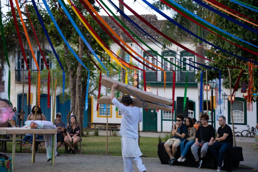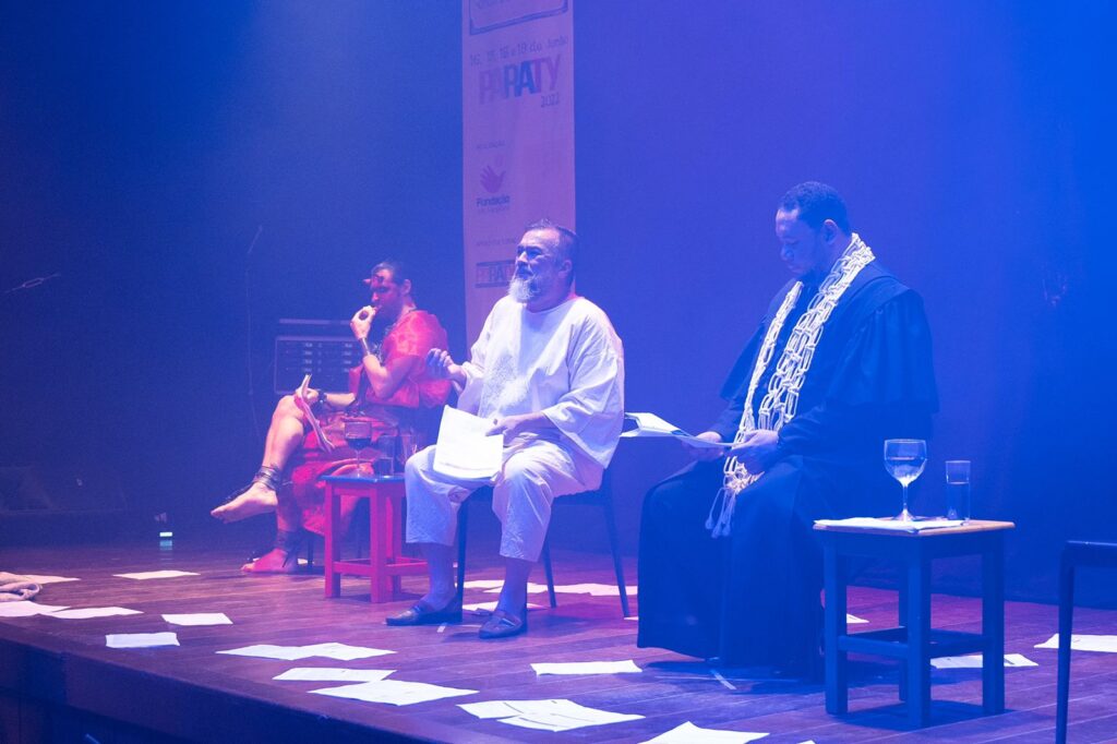 Na mesma Casa de Cultura, momentos depois, tivemos a encenação e leitura dramática da cena “O julgamento de João Grilo”, de uma das obras mais importantes e famosas de Suassuna. A adaptação do texto, realizada pelo coordenador artístico José Roberto Souza, estava impecável, com críticas e colocações atuais e que remetiam diretamente aos presentes, arrancando boas gargalhadas do público. Os atores, em sua maioria da cidade de Paraty também foram uma grata surpresa, com interpretações grandiosas e envolventes. Mas o ponto alto foi a participação do desembargador Guilherme da Costa Wagner Junior que interpretou o “Jesus Negro” e encantou a todos. Se estava nervoso, ninguém notou, dada a tamanha destreza e convicção que atuou. Para fecharmos com chave de ouro, temos que aplaudir de pé as intervenções de Aramis Trindade, como Ariano Suassuna, auto explicando e se elogiando, sobre a obra. Bravissimo!