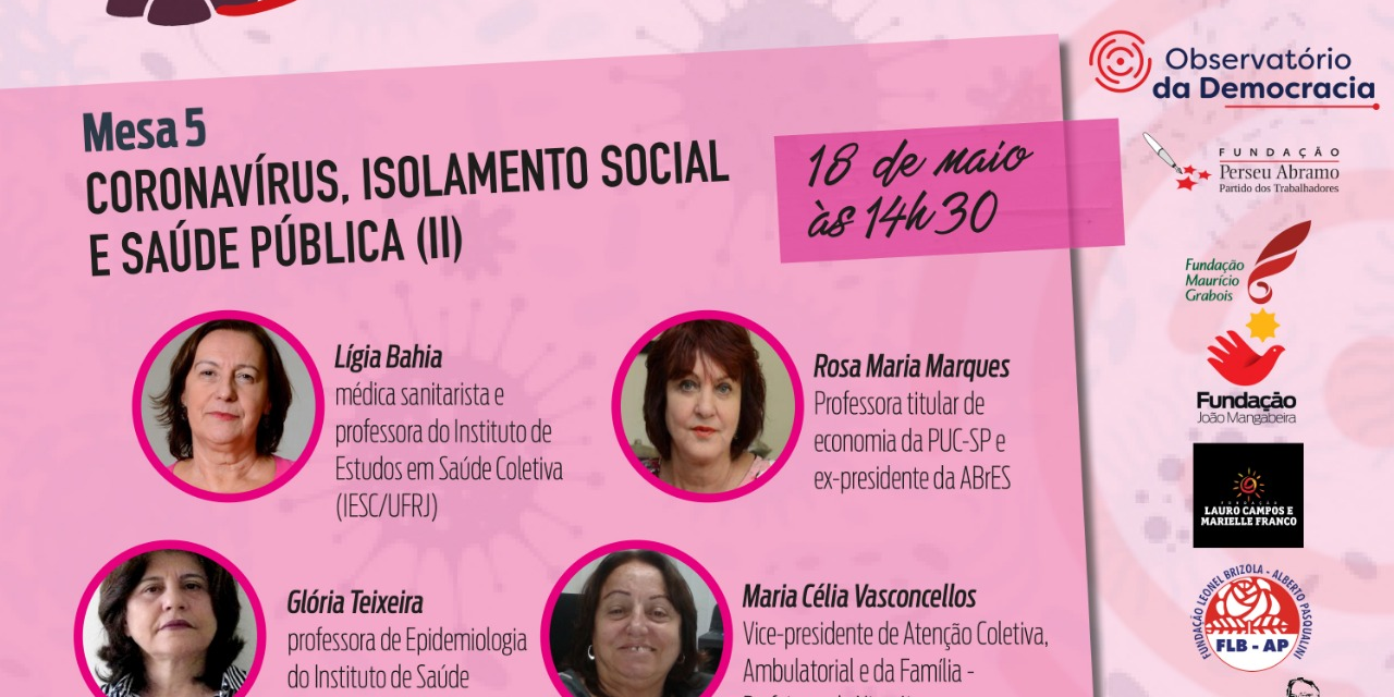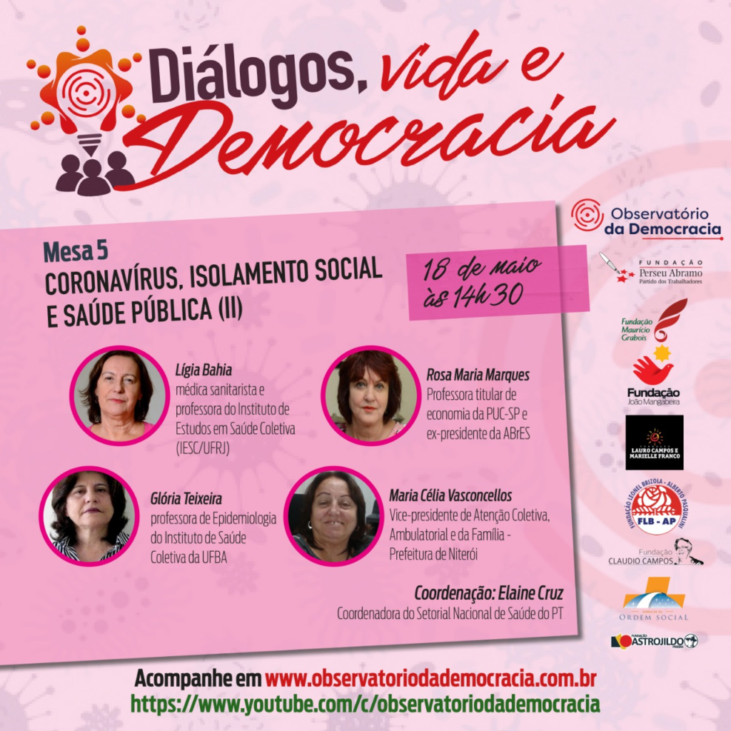 Na segunda, 18/05, às 14h30, o Observatório da Democracia dá continuidade ao Ciclo Diálogos, Vida e Democracia, organizado pelo Observatório da Democracia com o tema Coronavírus, Isolamento Social e Saúde Pública. Nessa edição, que será coordenada pela Coordenadora do Setorial Nacional de Saúde do PT Elaine Cruz, farão parte da mesa a médica sanitarista e professora do Instituto de Estudos em Saúde Coletiva (IESC/UFRJ) Lígia Bahia; a professora de Epidemiologia do Instituto de Saúde Coletiva da UFBA Glória Teixeira; a professora titular de economia da PUC-SP e ex-presidente da ABrES Rosa Maria Marques e a vice-presidente de Atenção Coletiva, Ambulatorial e da Família da Prefeitura de Niterói, Maria Célia Vasconcellos.